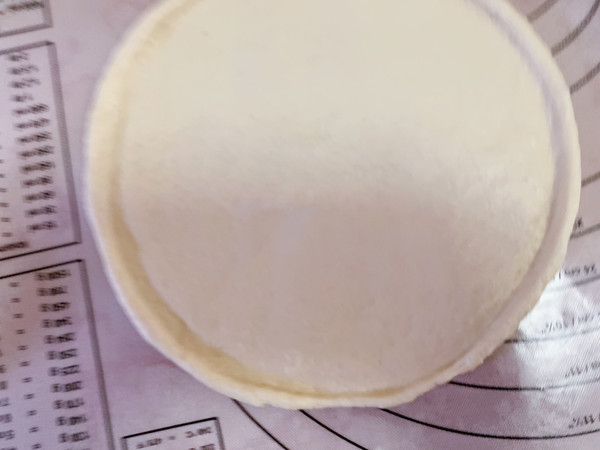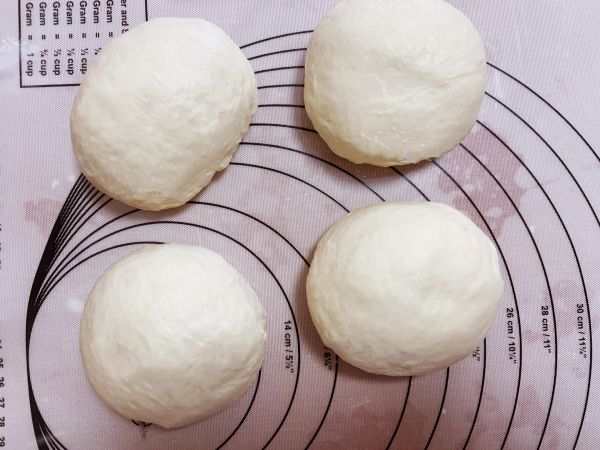 发酵好后取出排气,不用揉,平均分成四份,团成圆形,盖保鲜膜松弛15分钟左右。