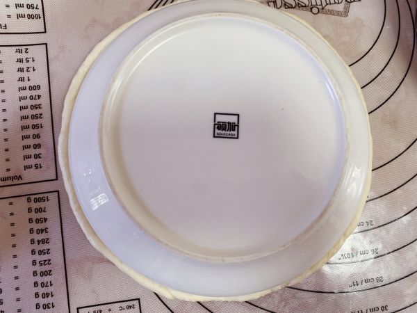 如果没有披萨盘的话面团擀平后移进烤盘,取家里一个八寸的大碗或者碟子(喜欢什么尺寸就拿什么尺寸的,边缘抹点干粉)倒扣在面片上,,围着碟子边边转圈圈向上搓,定型好后,把碗慢慢取下来。