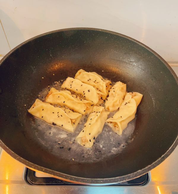 底部淀粉水收干,锅贴也熟了,撒入少许黑白芝麻。