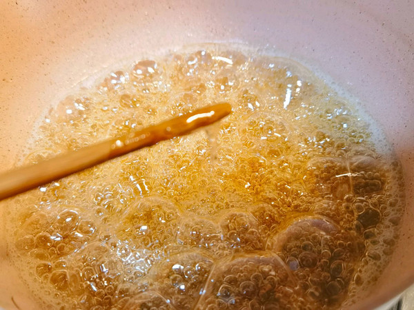 加热至冰糖完全融化,糖浆会开始冒大泡。