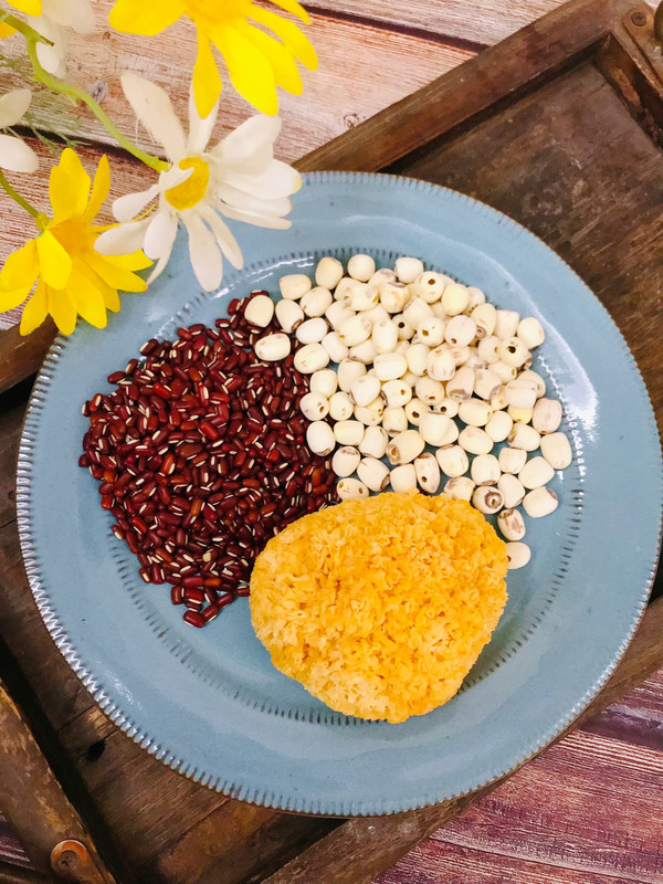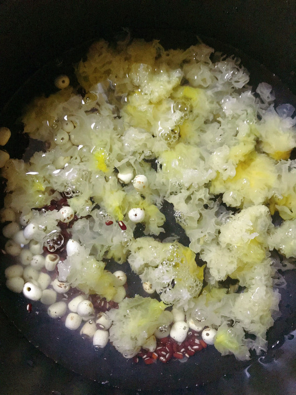 泡发好的银耳去根部,撕成小块和莲子、赤小豆一起放入电压力锅中