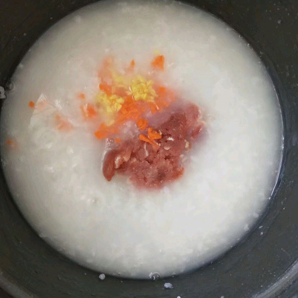 粥熬好之后开锅,放入胡萝卜和瘦肉,继续煮15分钟。