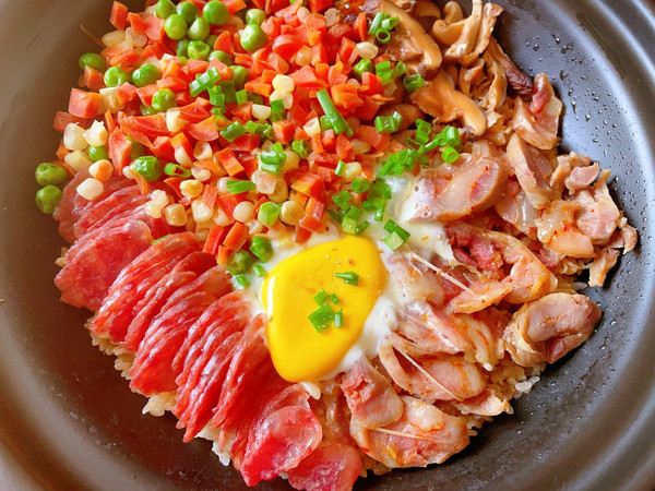 1.准备配菜 2.米饭用筷子扎点孔,铺上配菜鸡蛋蔬菜等 3.耗油生抽豉油适量加开水小半碗的样拌匀淋菜上盖上锅盖小火大概十分钟,关火闷5到8分钟 此处火候特别需要注意,感觉有点小糊味赶紧关火