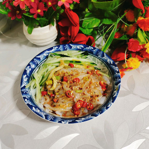 刮好的凉粉放入碗中,搭配一点黄瓜丝!