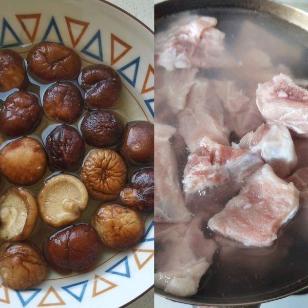 干香菇清洗干净之后泡水到香菇变软,排骨清洗后冷水下锅,加料酒和姜焯水。