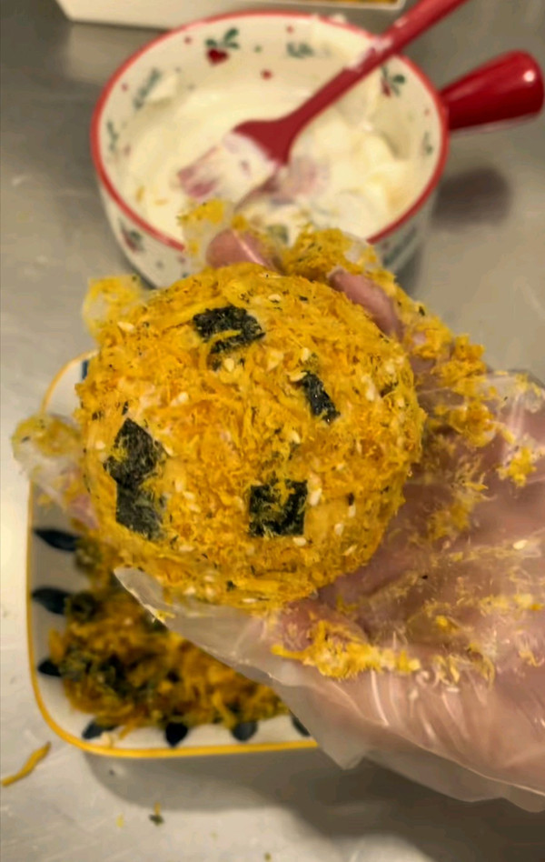 外面也裹一层沙拉酱,在肉松里滚一下。