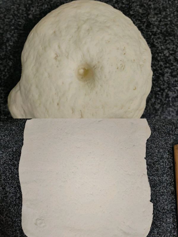 大概20分钟左右,用手戳一个洞,轻微回弹,就说明发酵好了,再次揉面团排气。 分成2份,擀成长方形面块。