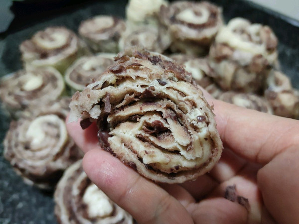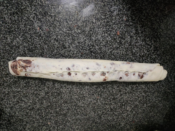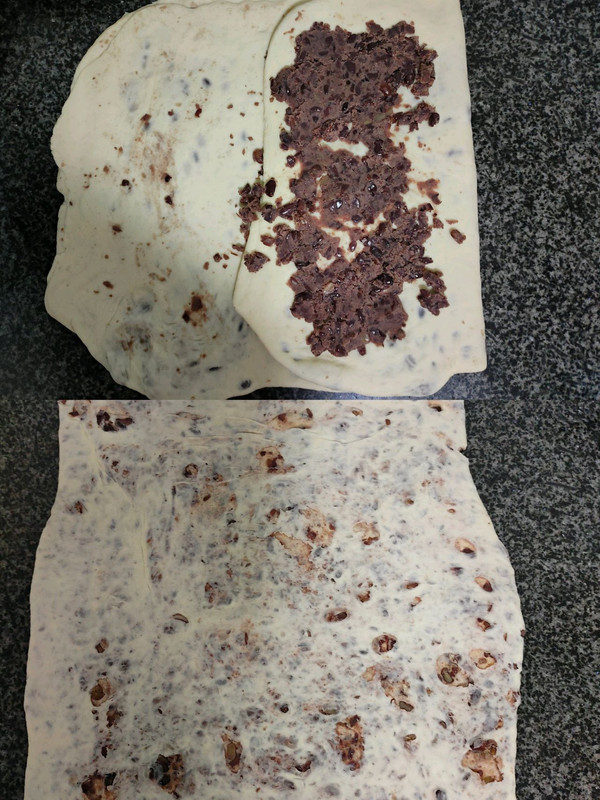一边铺上红豆馅,另一边面盖上,排掉空气,擀薄,然后中间放红豆馅,再把面盖上去