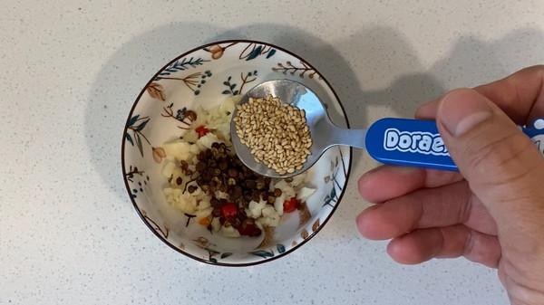 小碗中加入 小米椒 蒜末 花椒粒 白芝麻
