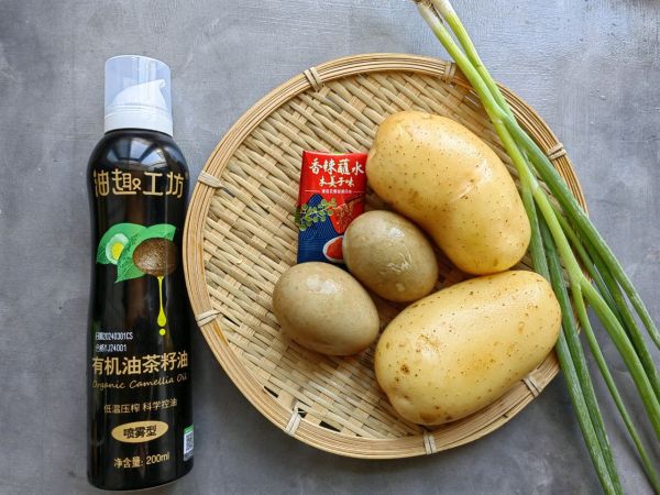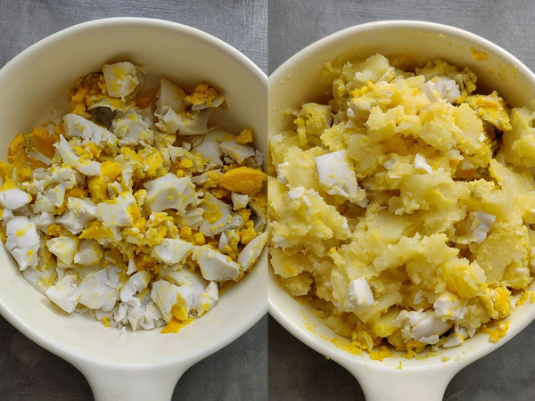 蒸好咸鸭蛋去壳捣碎;蒸好的土豆片用勺子简单压碎。