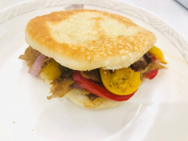 锅中加油煮沸转小火加入蒜片和大葱碎炒黄爆香,加入红、黄和绿彩椒快速大火过一遍油色泽艳丽,加入腌制好的羊肉卷。