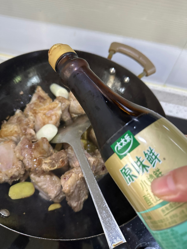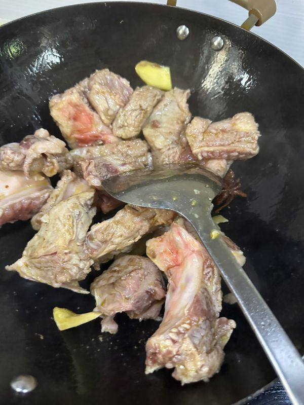 锅中放入适量油边炒排骨变色 放入八角2个 姜片