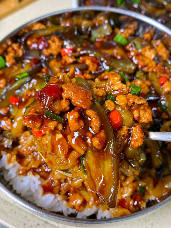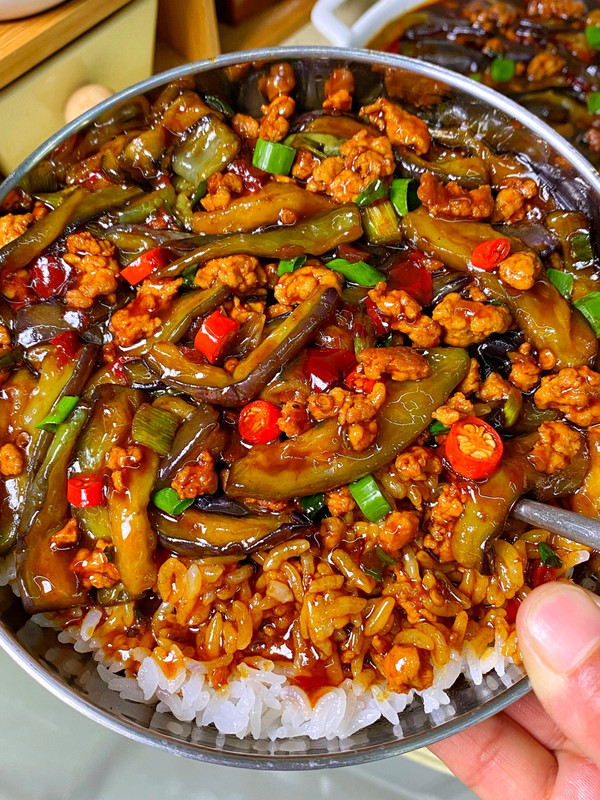 2⃣️茄子洗净切长条,加少许盐抓均匀腌制10分钟挤去多余水分;油热放茄子煎微黄装盘 3⃣️肉末翻炒变色,放葱花爆香,放茄子翻炒,淋酱汁煮至浓稠,撒葱花小米辣即可~