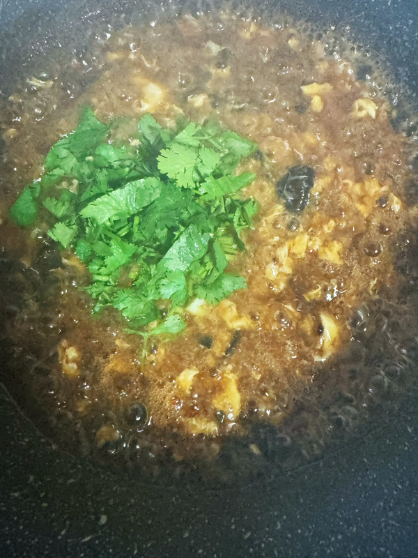 水淀粉勾芡后,淋入鸡蛋液,搅散,出锅前撒上香菜和虾皮即可;