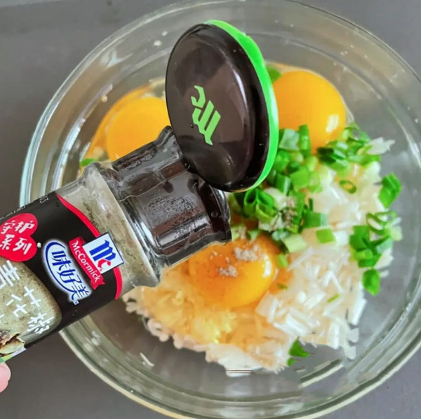将金针菇放入容器里,打入鸡蛋、小葱、椒盐