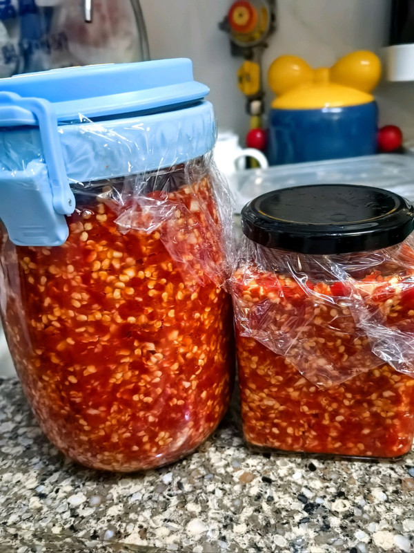 找两个无油无水的罐子,罐子内用高度白酒清洗一下,把小米辣沫装入罐子中压实,上面喷上少许白酒。 瓶口处留有空隙发酵一周即可。扣盖之前在瓶口抹上白酒盖上保鲜膜防止进入空气。