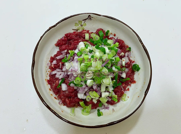 肉馅放入大碗中,加酱油、蚝油、老抽、料酒、姜末、胡椒粉、鸡精、盐、油、倒入花椒水分次加入顺着一个方向搅拌,充分让牛肉吸收水分,搅拌至上劲,再倒入洋葱、葱花