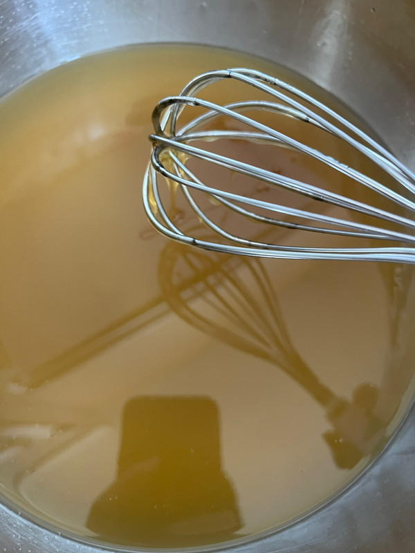 现在做饼皮,将花生油和转化糖浆、枧水倒入盆中搅拌均匀。