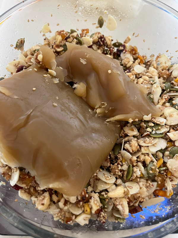 烤箱预热180度,所有干果放入烤箱烤5~8分钟(微微上色即可),然后晾凉备用。