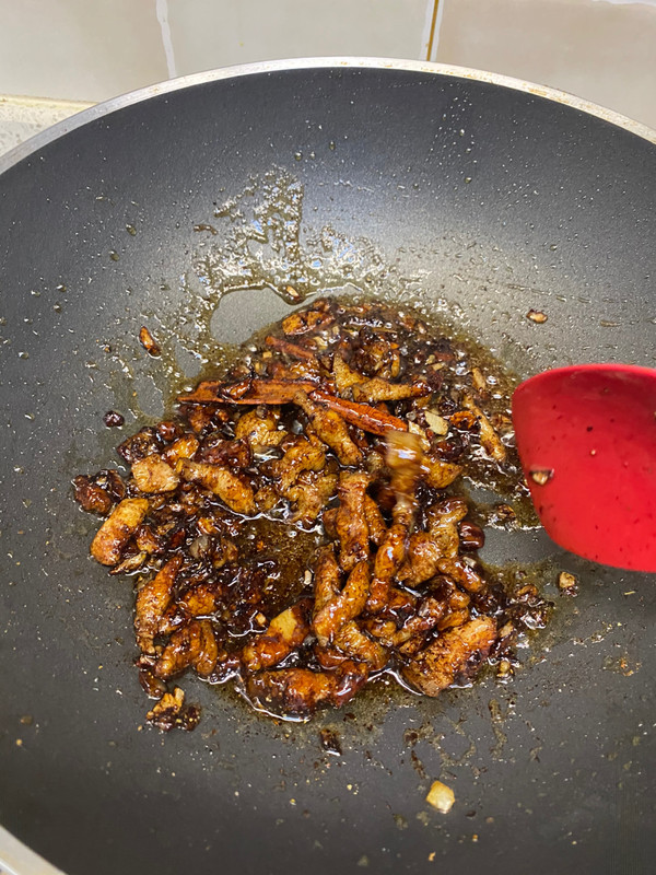 再倒入五花肉丁、桂皮、姜末继续炒到吐油