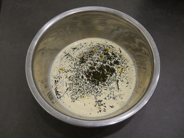 制作冷萃白葡萄柑橘煎茶奶油:在淡奶油中倒入茶叶,搅匀后密封冷藏8小时,次日滤掉茶叶,加入细砂糖打发至所需的状态;注意淡奶油经过茶叶浸泡后会有所损耗,如果奶油份量不足,可以直接添加;