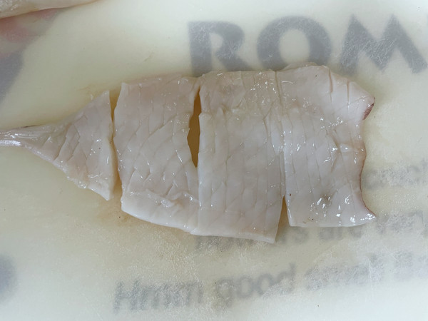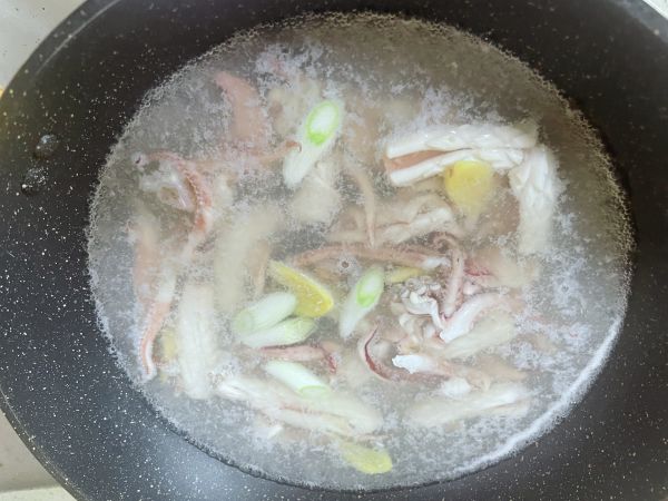 锅中水开放入鱿鱼、葱姜、料酒焯水10秒钟快速捞出