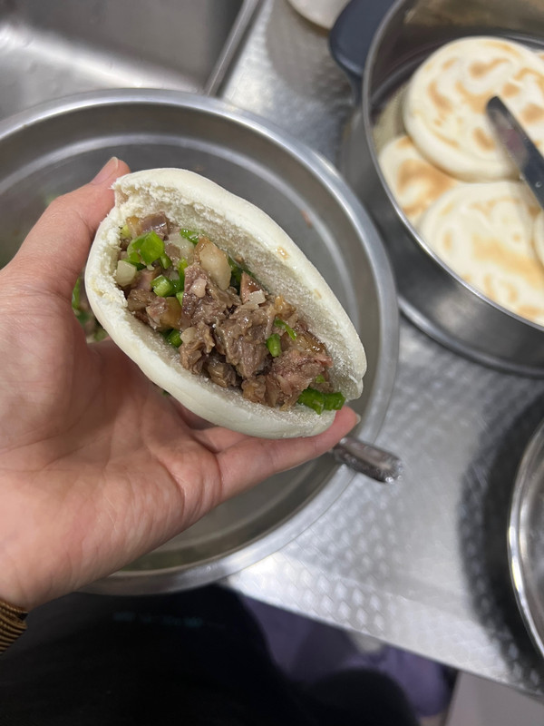 加入调味品搅拌均匀,现成的小饼中间切开掏个洞不要切断,把馅放入饼中