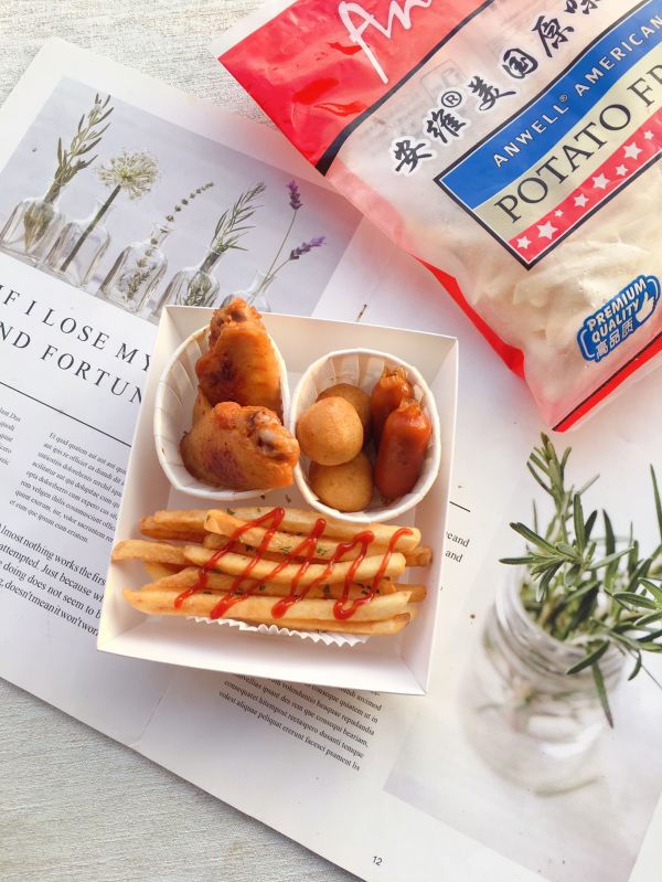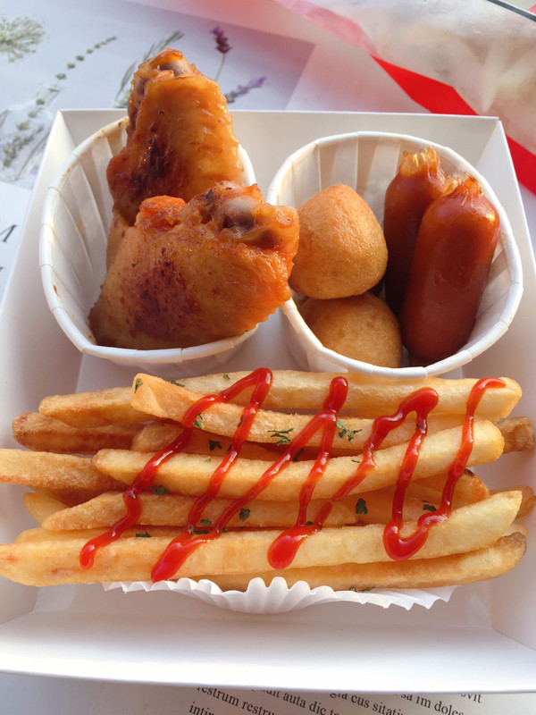 鸡翅、香肠、鱼蛋分开做好、一起放入小食盒中