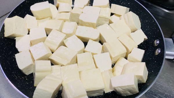 豆干用不粘锅煎至四面金黄,微焦脆脆口感甚是丰富。