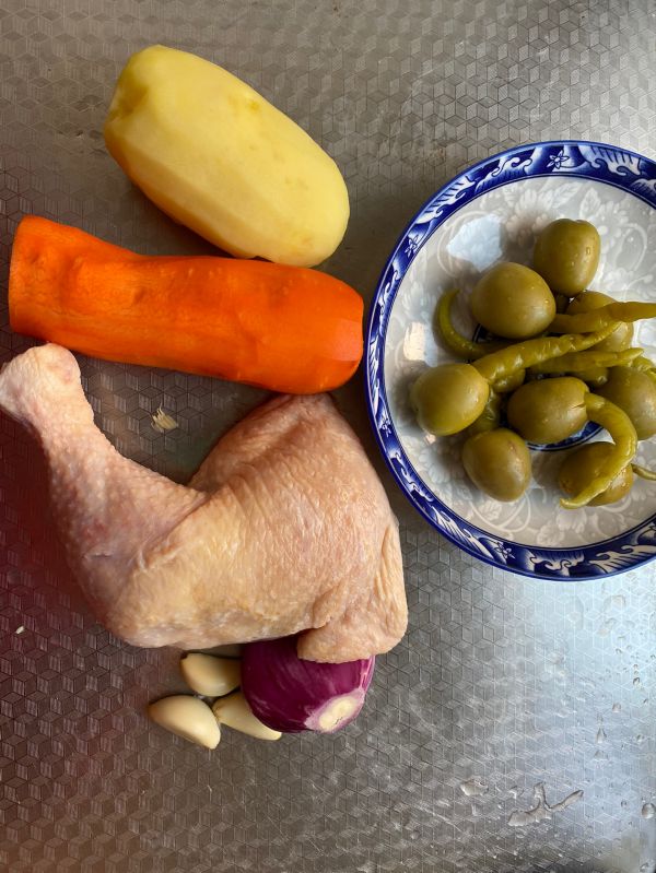 鸡腿化冻,土豆胡萝卜去皮。
