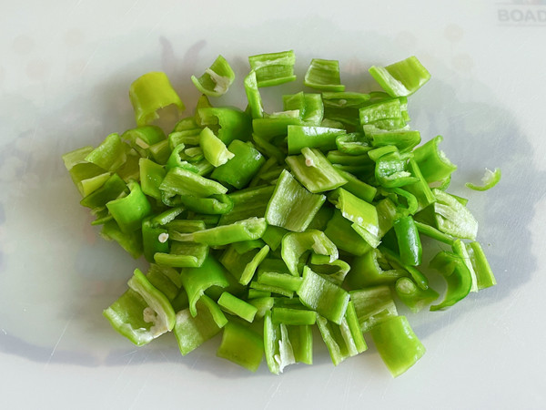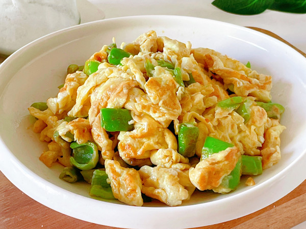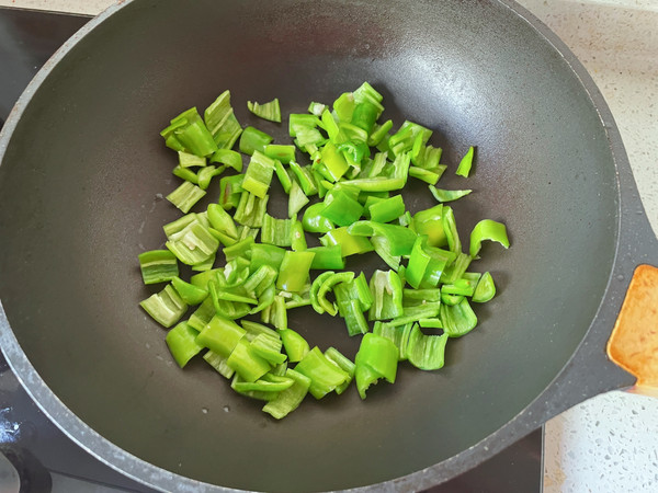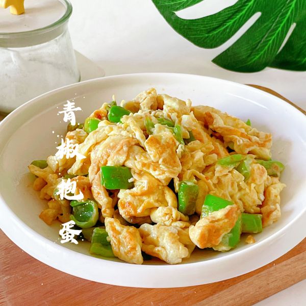 炒好的青椒倒入鸡蛋里,加盐、鸡精、葱花充分打散