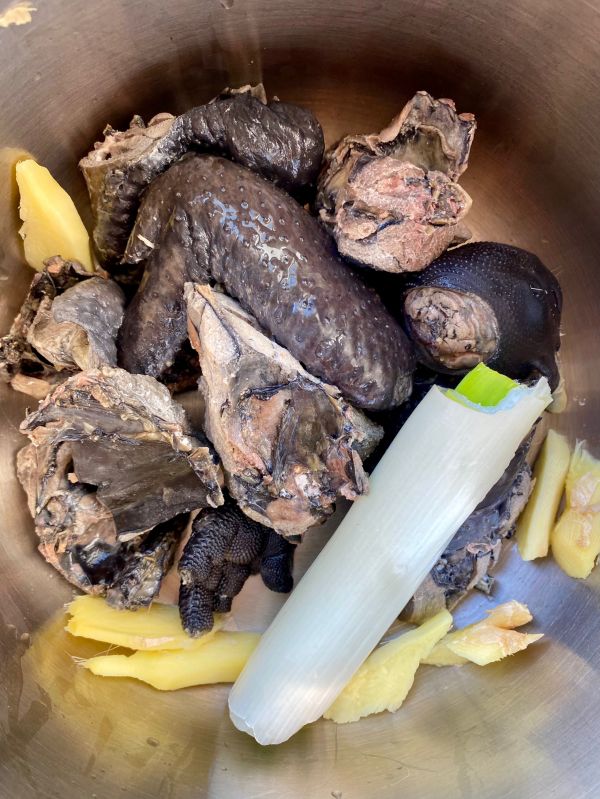 乌鸡洗净放高压锅中,加入葱段姜片