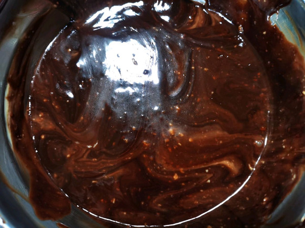 把融化好的黄油倒入到牛奶巧克力鸡蛋面糊中搅拌均匀。