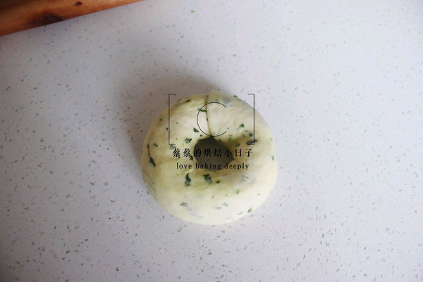 贝果面团中的材料除去香菜,其他的材料放入厨师机开始打面。贝果的含水量相对来说比较低,不用揉到很薄的手套膜状态,揉到面团光滑,弹性与延展性均衡就可以。可以参考我视频中的揉面时间,揉好的面团再加入洗净切碎的香菜,开低速拌均匀就行,不用过度揉。