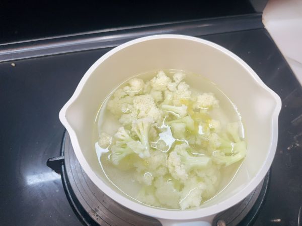 菜花掰成小朵,洗净,水开焯水