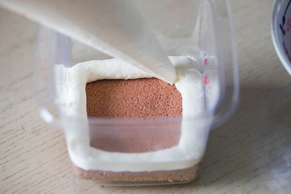 在盒子底部放上一片蛋糕,刷一层车厘子酒;