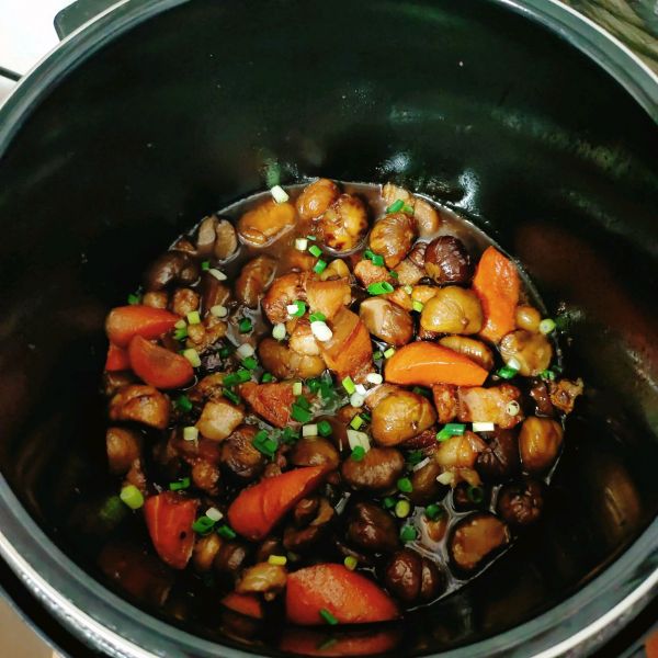 时间到了,气压阀落下,打开盖子,把板栗和胡萝卜倒进去,按“开盖煮”!