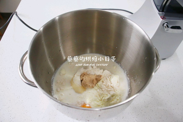 面团中的材料除去黄油和盐,其余材料放进厨师机桶揉面。