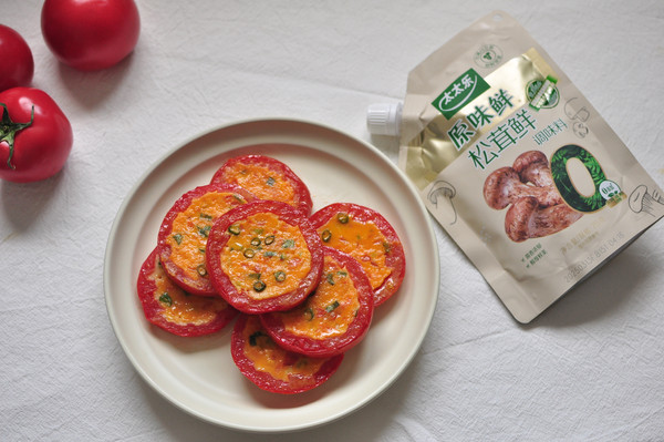 挖出的西红柿切碎,加入 2 个鸡蛋、适量盐、面粉、葱花和“太太乐原味鲜”松茸鲜调味料拌匀。所有成分来自熟悉食材的“太太乐原味鲜”松茸鲜调味料,甄选云南野生松茸,风味浓郁,加倍鲜美,是我一直使用的调味品。