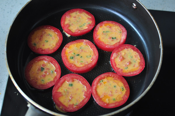 平底锅烧热喷适量食用油,先放入西红柿圈。