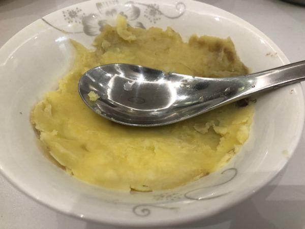 蒸熟的红薯勺背捣成泥状