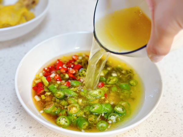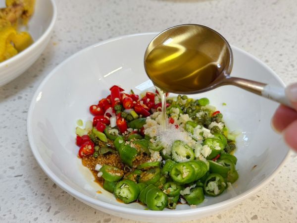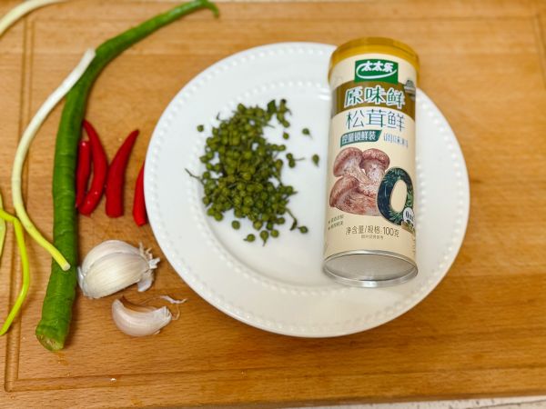 藤椒碗里,依次调味:青红小米辣,蒜末,盐,,松茸鲜,生抽