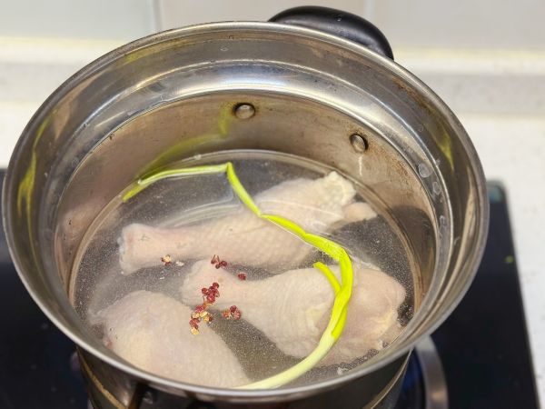 鸡腿冷水下锅,加葱、花椒粒、料酒,煮20分钟、(放2-3个栀子煮出来色泽漂亮)