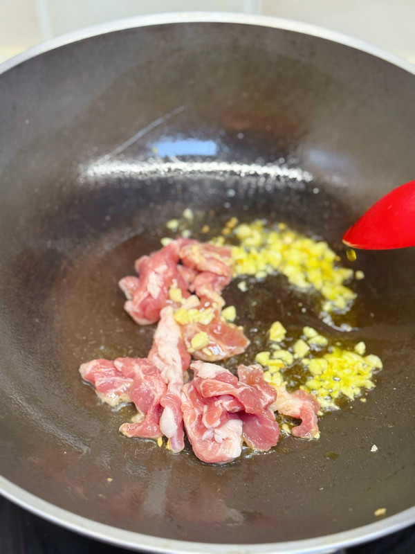 锅里油热炒姜蒜和肉片