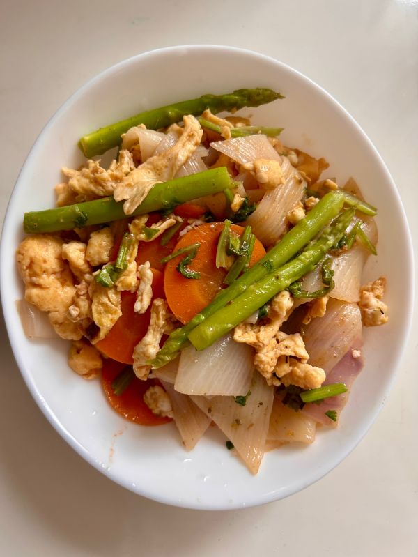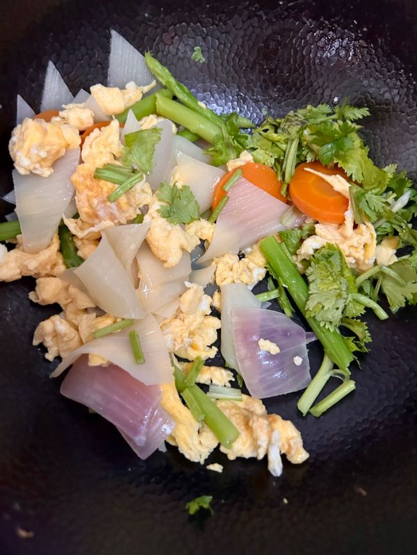 锅里喷油放入洋葱胡萝卜炒香加点水放入芦笋段煮开一分钟