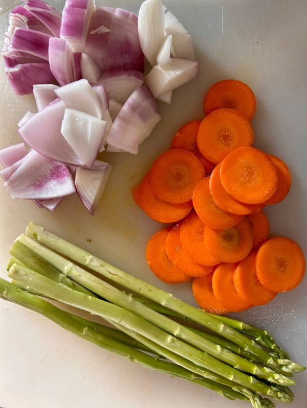 准备要放的蔬菜,芦笋胡萝卜大块洋葱,因为娃不吃洋葱,又想要那个香味,每次做完都要单独挑出来,所以都用大块来做