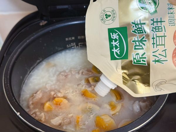 加入腌制后的肉片,皮蛋丁 盐,松茸鲜,一小勺植物油,姜丝 盖上电饭锅盖子、继续煮粥3-5分