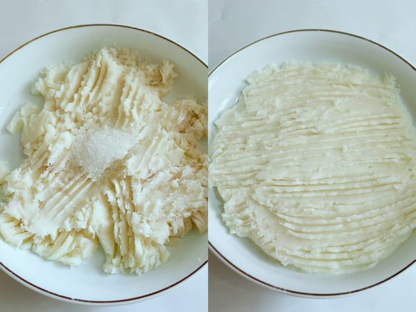 蒸好的山药加10克沙糖,碾压成泥状