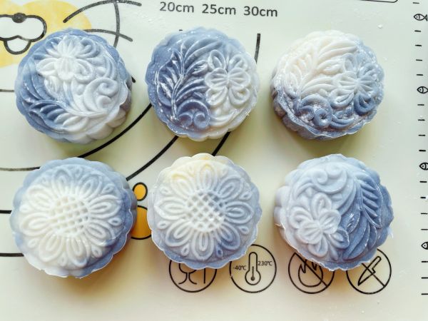 混合搓均匀,分成6份压扁擀开包入馅料,虎口收紧,表面刷点熟粉,用模具按压出月饼形状