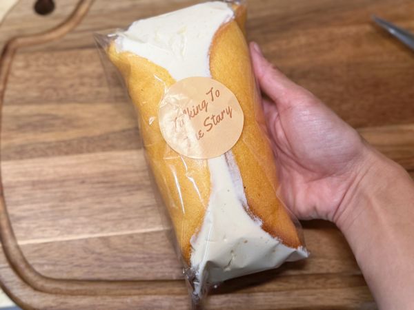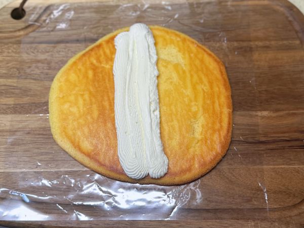 然后蛋糕片烤好冷却后,台面垫上玻璃放上蛋糕片,反面朝上,挤入几条淡奶油